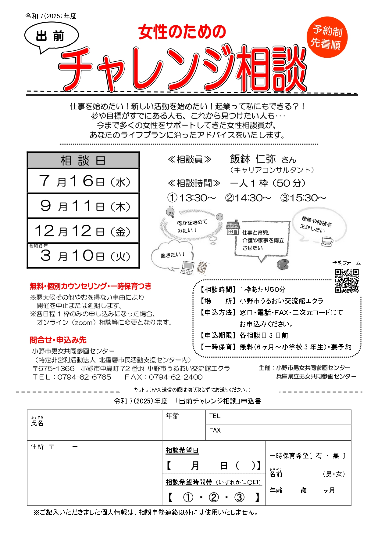 相談時間:①13:30~ ②14:30~ ③15:30~ (1人1コマ・50分)